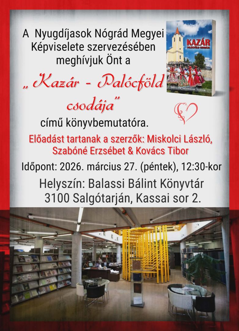 A Nyugdíjasok Nógrád Megyei Képviselete szervezésében meghívjuk Önt a "Kazár - Palócföld csodája" című könyvbemutatóra.