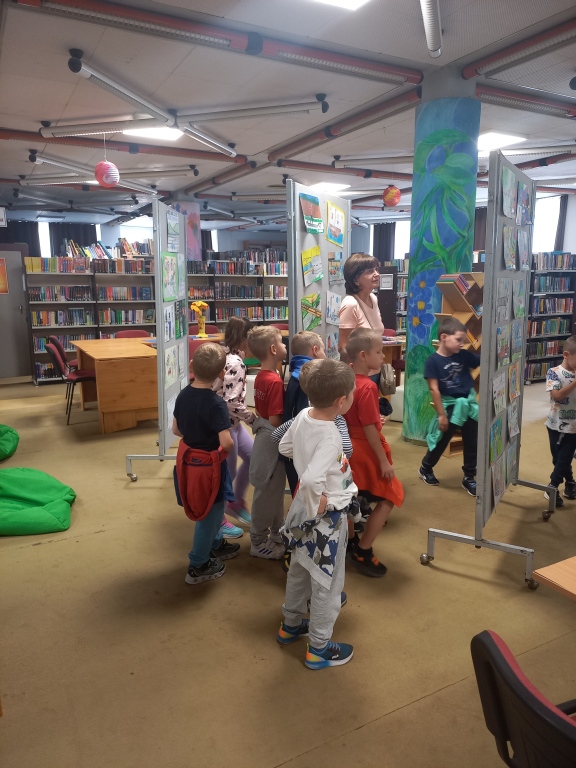 Érdeklődéssel tekintették meg az "Így közlekedtek ti!" című gyermekrajz-kiállítást, majd kíváncsian nézegették a könyveket és felfedezték a könyvtár polcait.
