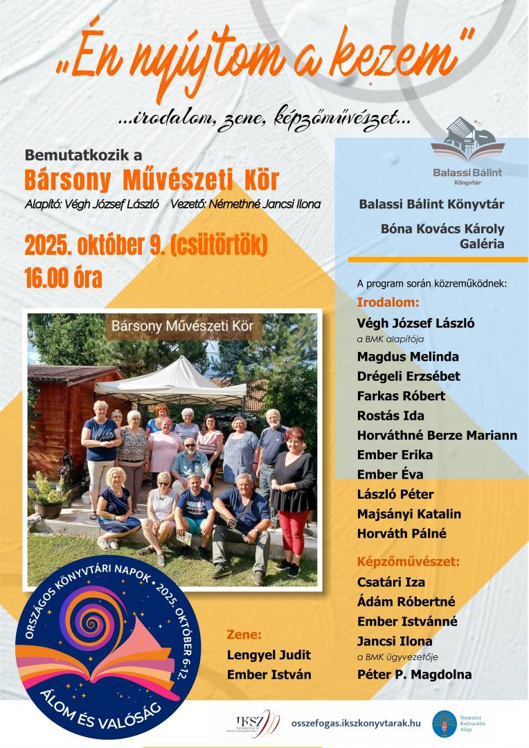 Az Országos Könyvtári Napok keretében 2025. október 9-én 16 órai kezdettel bemutatkozik a Bársony Művészeti Kör.