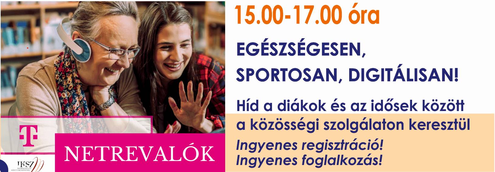 Könyvtári foglalkozások keretében diákok oktatják az idősebb generációt az internet és a digitális eszközök használatának elsajátítására. A programhoz való csatlakozás ingyenes. A diákok és az idősek is regisztrálhatnak a Netrevalók program honlapján: https://helloszulo.hu/netrevalok