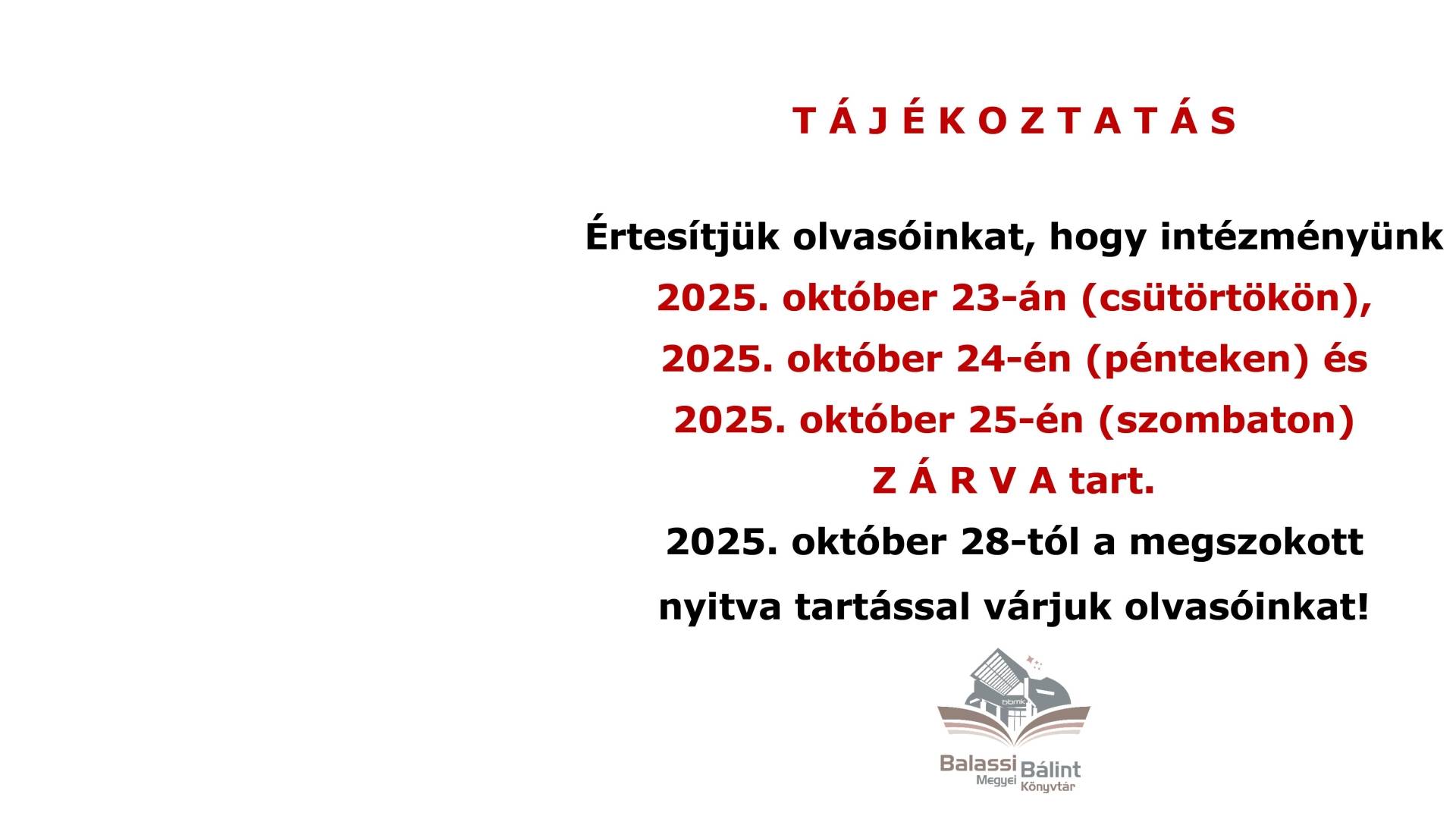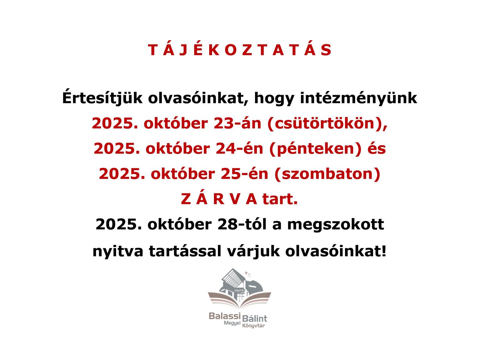 Értesítjük olvasóinkat, hogy intézményünk 2025. október 18-án (szombaton) 9.00-15.30 óráig tart nyitva.