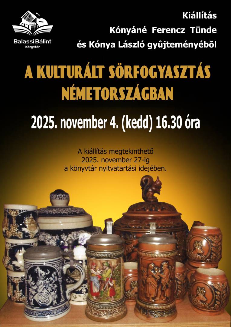2025. november 4-én nyílik kiállítás A kulturált sörfogyasztás Németországban címmel Kónyáné Ferencz Tünde és Kónya László gyűjteményéből.