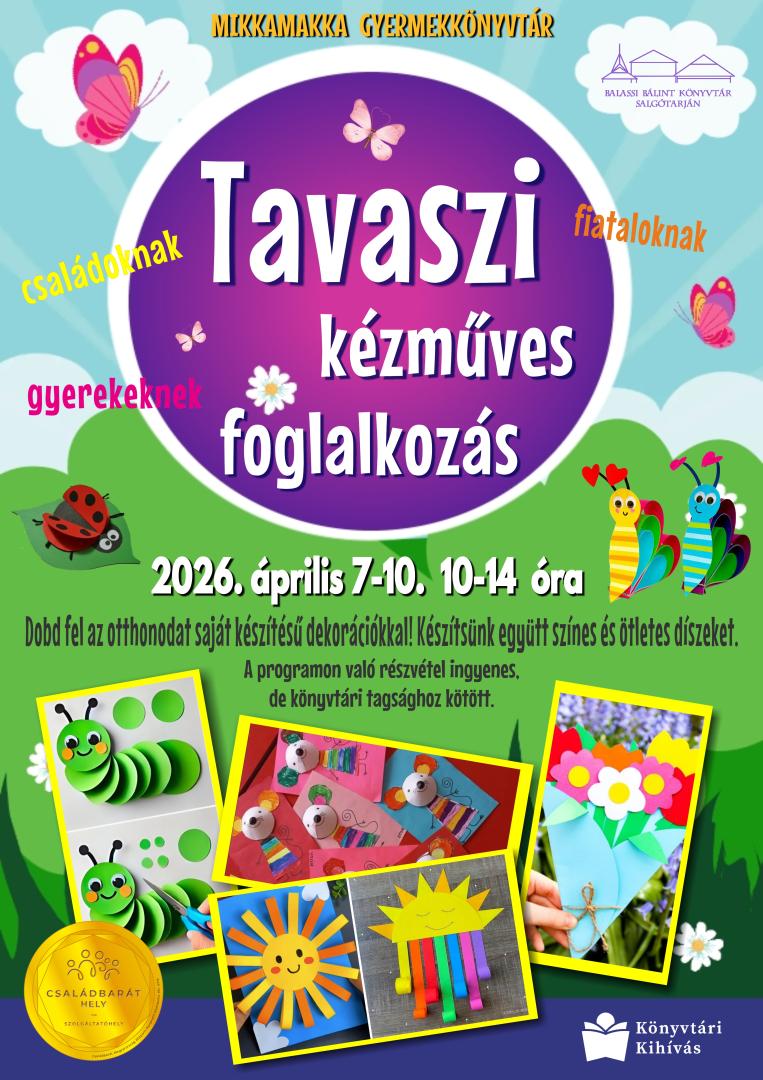 A tavaszi szünet napjain, 2026. április 7. és 10. között vidám kézműves foglalkozásokkal várjuk a gyerekeket, fiatalokat és a családokat a Mikkamakka Gyermekkönyvtárban! 🎨